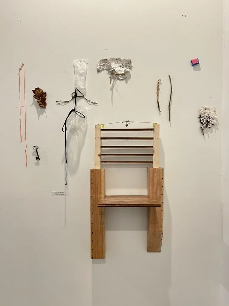 Found materials (wood, floorboards, iron nails, fishing wire, string, leaf, key, plastic wrap, cardboard, sticks, foam, tape, paper, mulch)